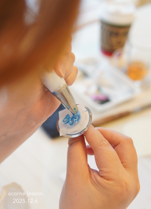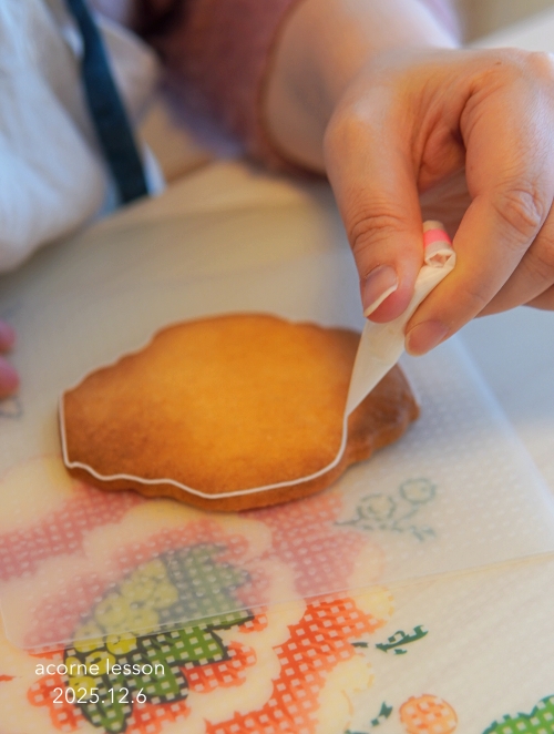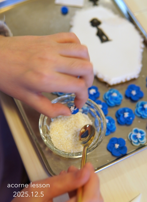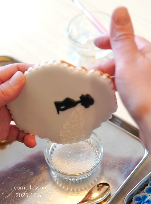 お花を乾かしている間に、クッキーの縁に滴模様を飾っていきます。