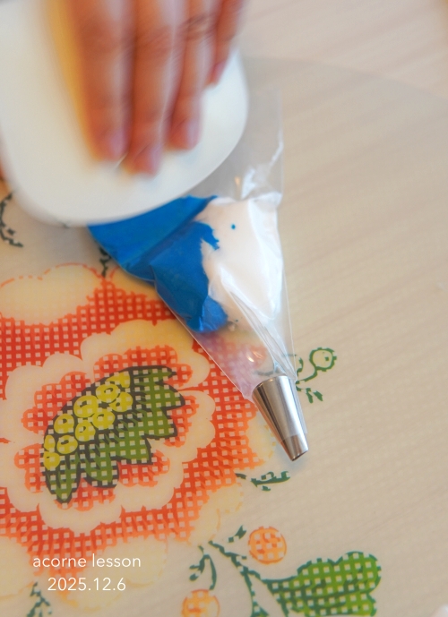 続いて、お花絞りをするために、口金をセットしてアイシングを詰める練習です。
