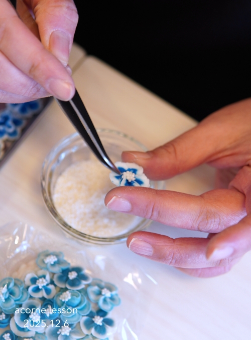 続いて、ある程度乾いたお花の中心をデコレーション。
