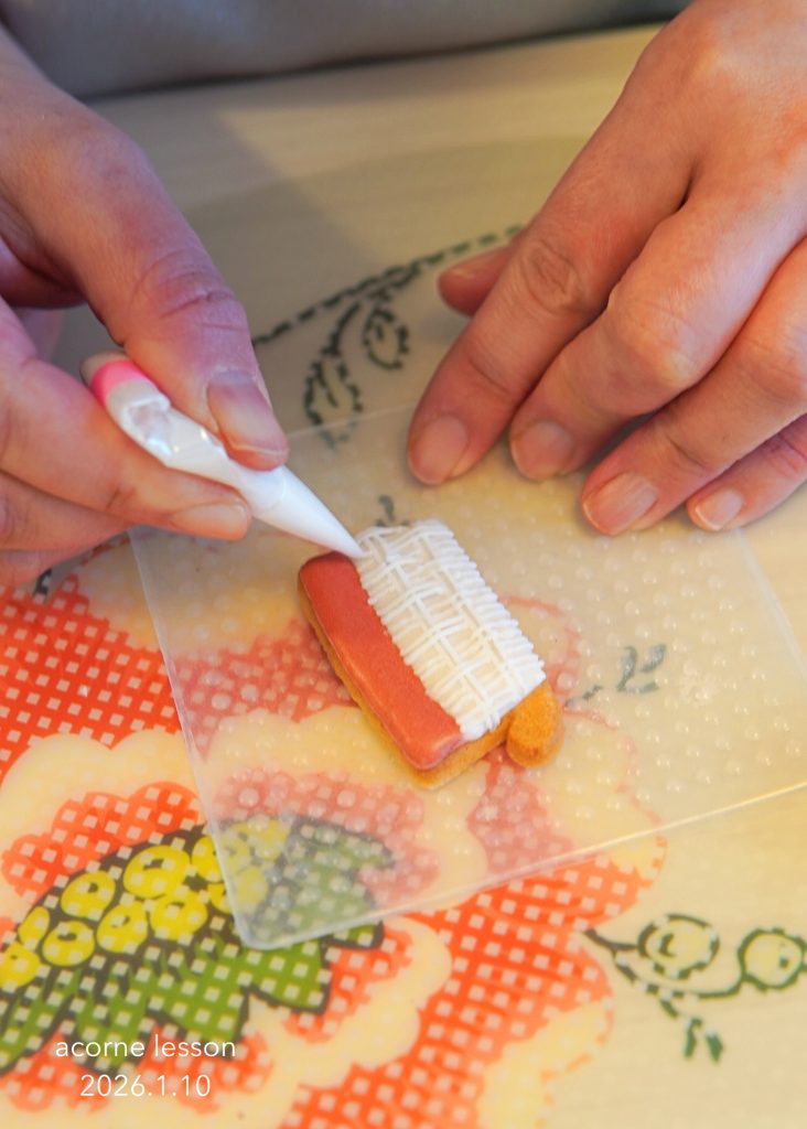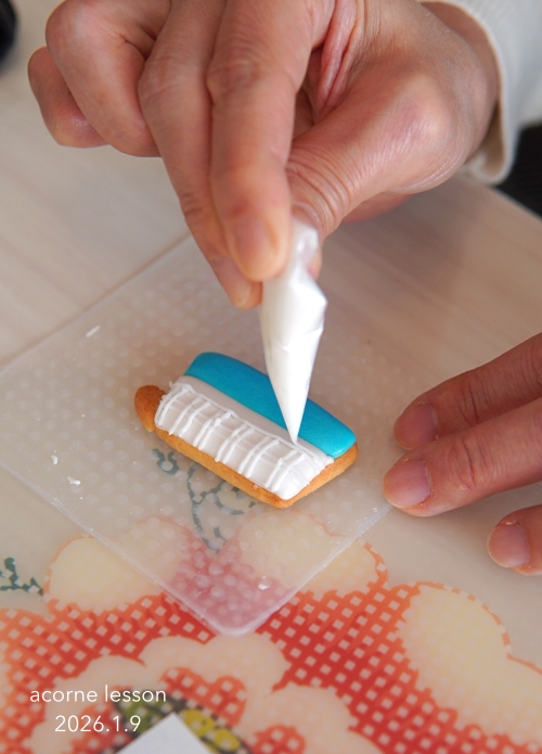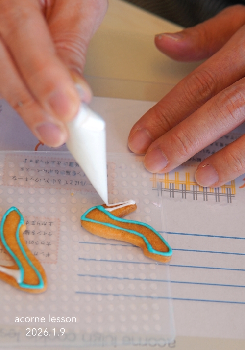 テンプレートで練習して、クッキーにアウトラインを描いたら、いよいよアイシングタイム。