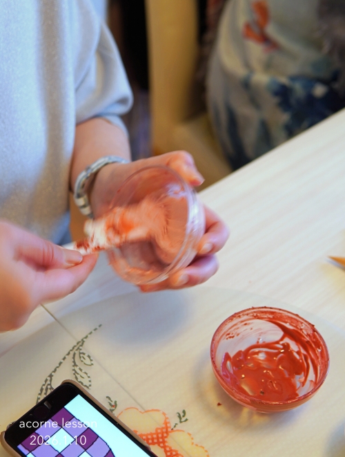 目指す色を見ながら、ブラウン・オレンジ・ノーテイストレッド、ブラック、クリスマスレッドなどを混ぜながら、「もうちょっと濃いかな〜」「もうちょっと赤よりかな〜」「もうちょっと透明感が〜」と皆さんと悪戦苦闘しながら作ってみました。