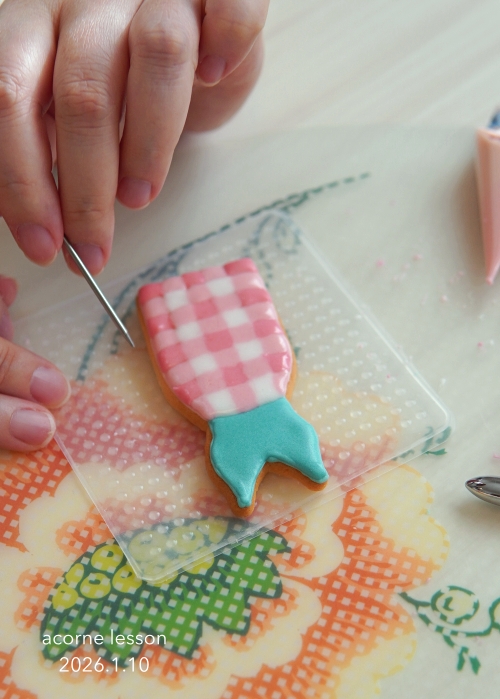濃淡で可愛いギンガムチェックも、一マスずつのアイシングの量とボコボコしないための馴染ませとスピード感、アイシングの固さなども大切。