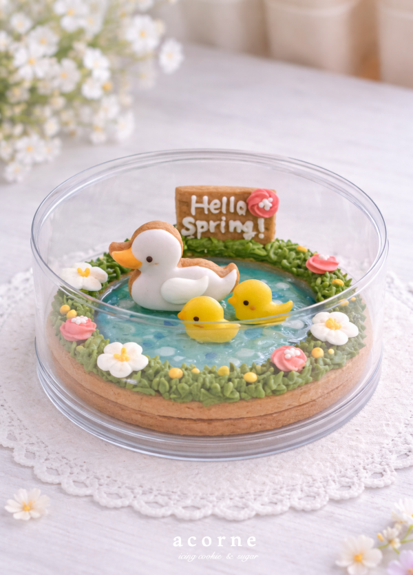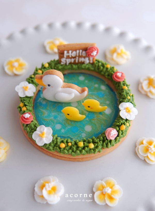 4月は春っぽく、あひる親子が春の香りを感じながら、のんびり池をおさんぽしているクッキーを考えてみました♡